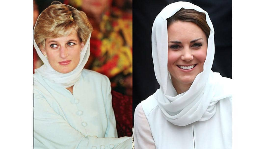9. Di foto ini Putri Diana sedang berkunjung ke Shaukat Khanum Memorial Hospital di Pakistan pada tahun 1996. Dan Kate Middleton sedang berkunjung ke Masjid Assyakirin di Malaysia pada tahun 2012.