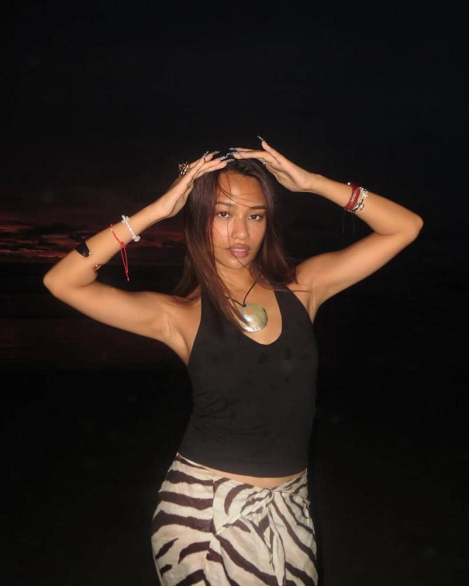 2. Esther Geraldine berpose dengan latar sunset di pantai pakai tank top hitam dan rok lilit motif zebra. Aksesori bracelet, bangle, kalung dan cincin jadi andalan Esther untuk melengkapi gaya ala island girl.