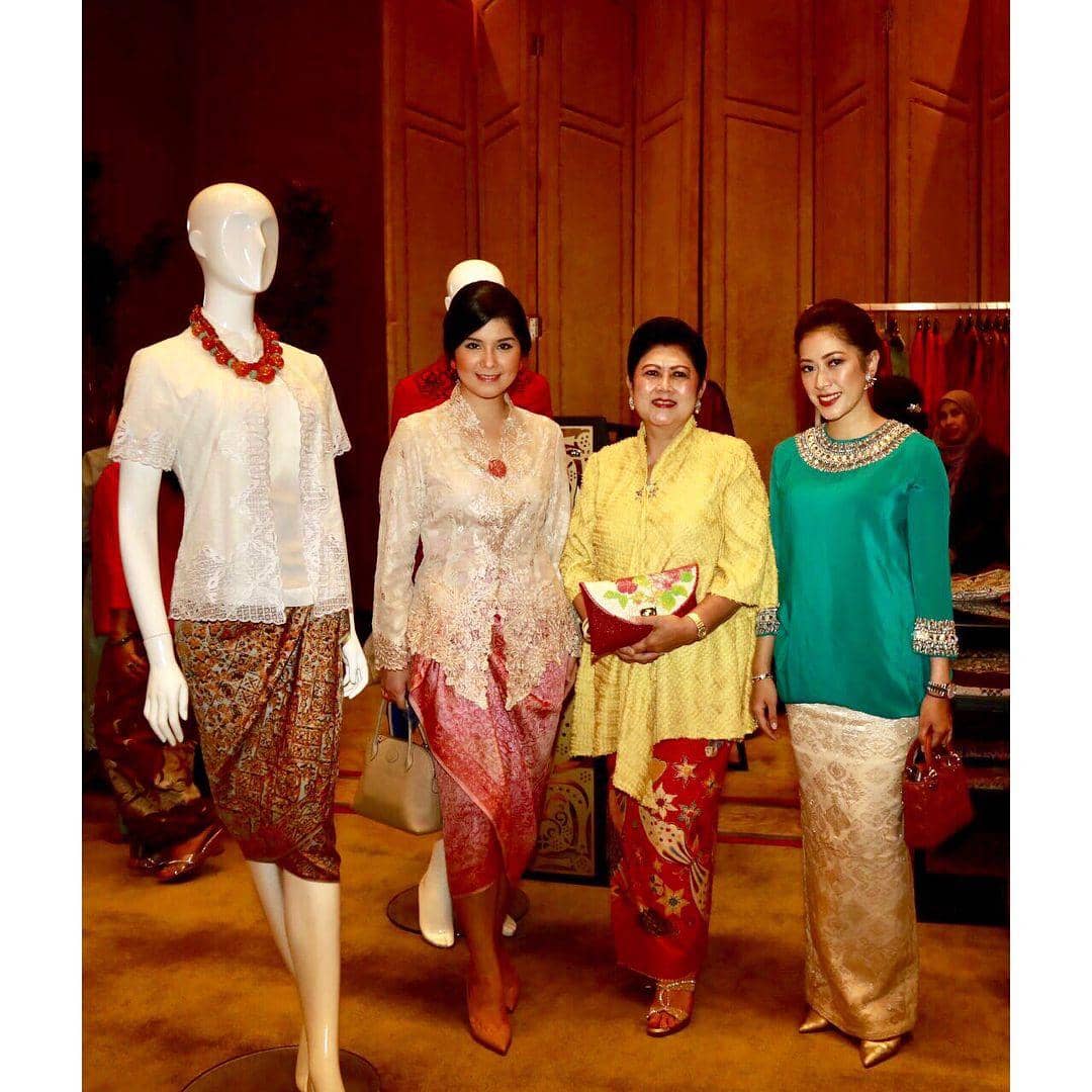 3. Tak kalah memesona dengan kedua menantunya. Ia memadu-padankan atasan tenun garut warna kuning dengan bawahan kain tradisional batik nuansa merah