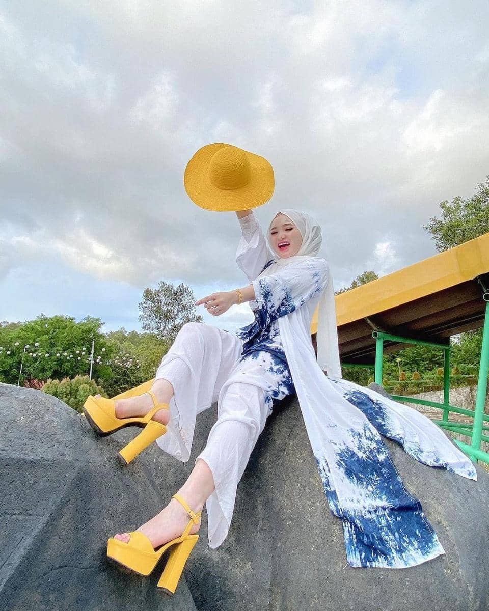 3. Selalu tampil dengan warna mencolok adalah ciri khas Herlin Kenza. Dan, chunky heels juga jadi aksesori wajib buatnya. Dengan topi dan heels yang warnanya match, Herlin memadu-padankannya dengan outer dan jumpsuit tie dye berwarna indigo.