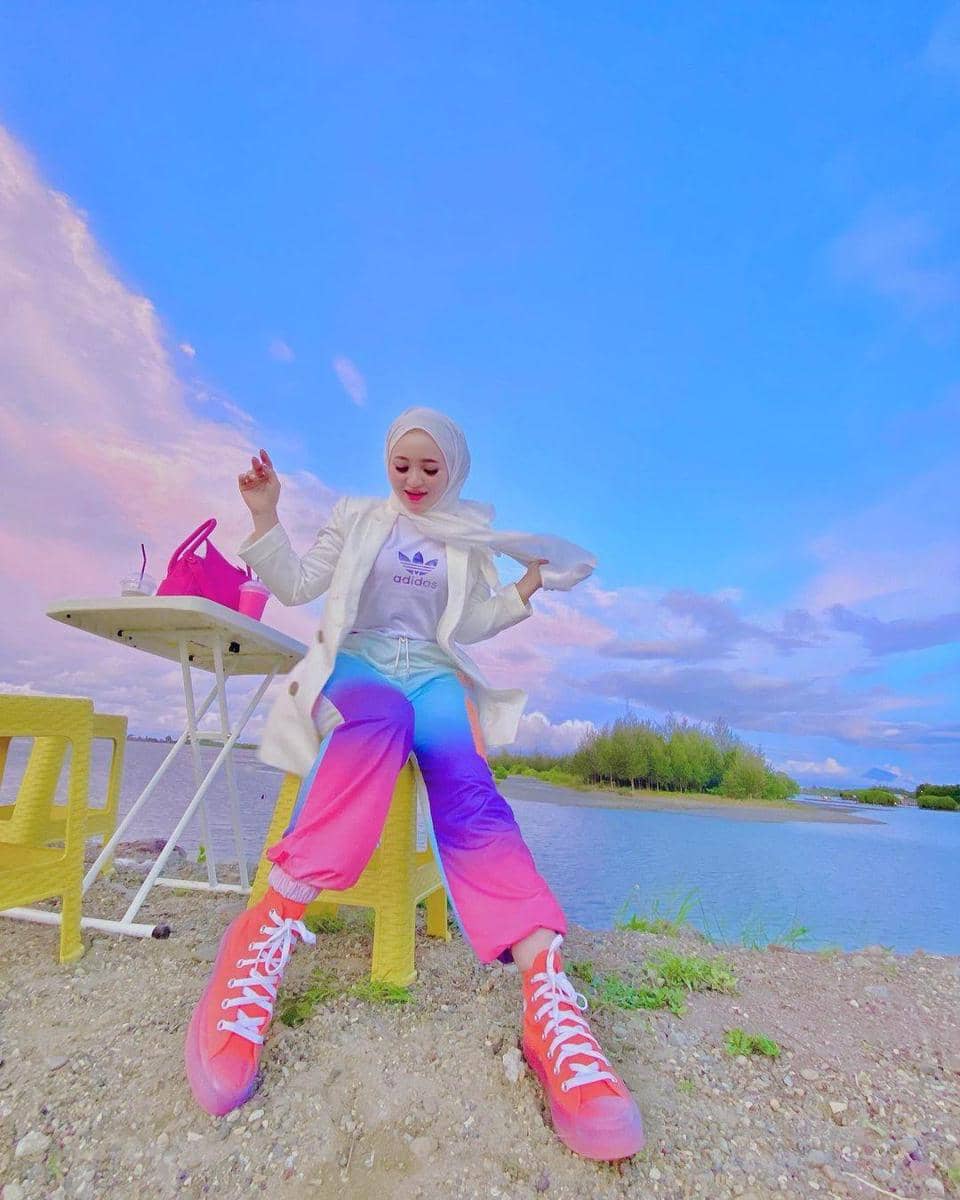 4. Dengan warna celana ombre yang mencolok, Herlin mengenakan kaus dan outer putih untuk mengimbangi penampilannya. Nggak lupa juga tas warna shocking pink yang jadi unsur dari ciri khas gayanya.