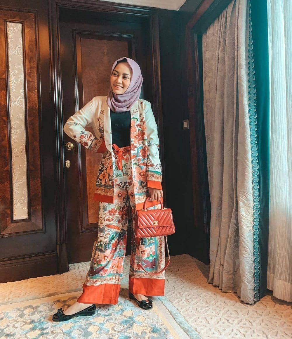 4. Flower power! Ciptakan penampilan hijab yang standout memakai busana motif floral yang dilengkapi dengan warna-warna cerah