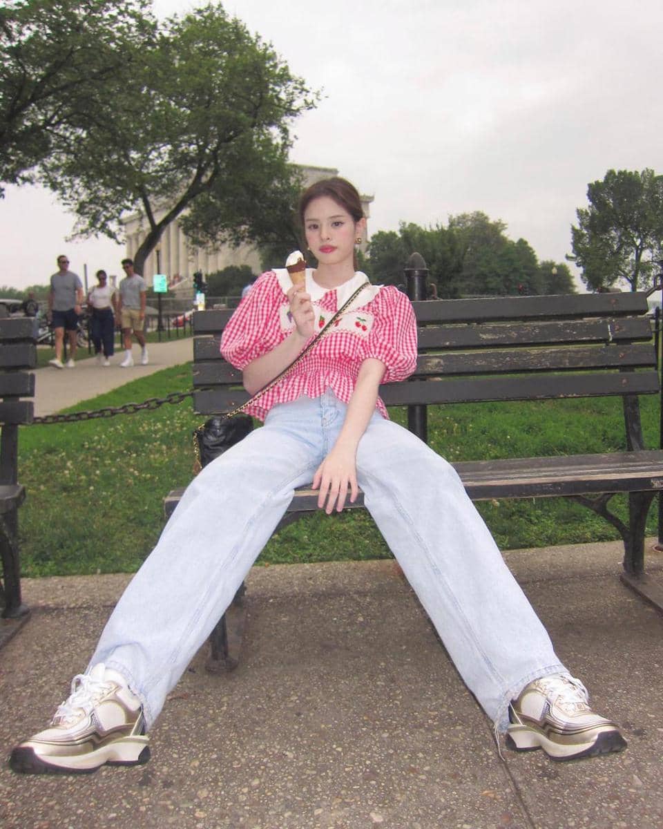 3. Pergi liburan ke Amerika Serikat, Ally Achiraya kenakan atasan gingham merah berkerah dengan celana panjang denim dan sepasang sneakers kesayangan sewaktu hangout di taman kota.