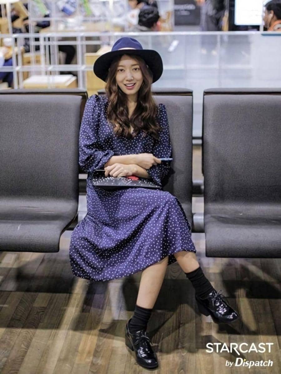 1. Gaya chic Park Shin Hye saat di bandara dengan dress, coat dan sunglasses sebagai aksesorinya.