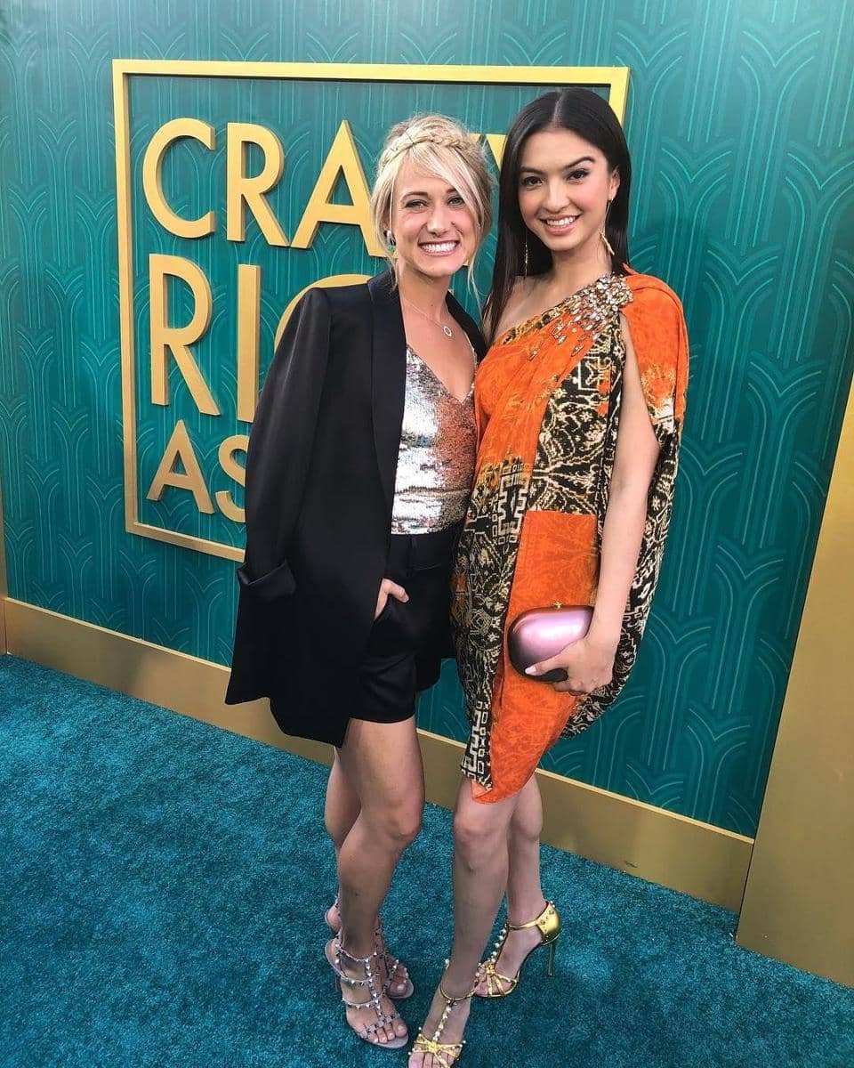 5. Bergaya etnik dalam balutan one shoulder dress nuansa orange ketika menghadiri premiere film layar lebar Crazy Rich Asians