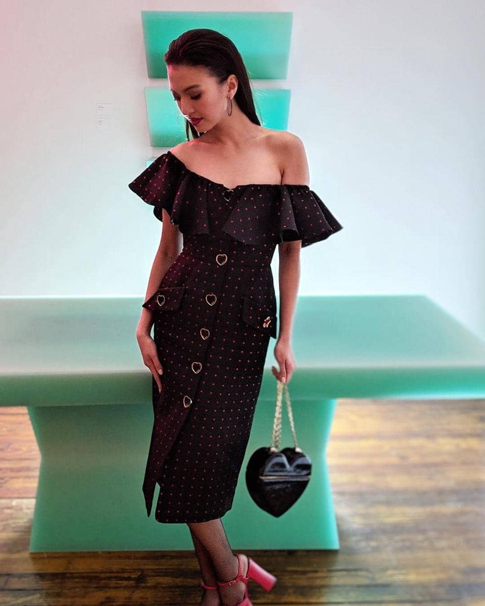 1. Playful sleek saat hadiri Victoria's Secret Fashion Show 2018, Raline kenakan off shoulder black polkadot dress. Statement clutch bikin penampilannya makin catchy!