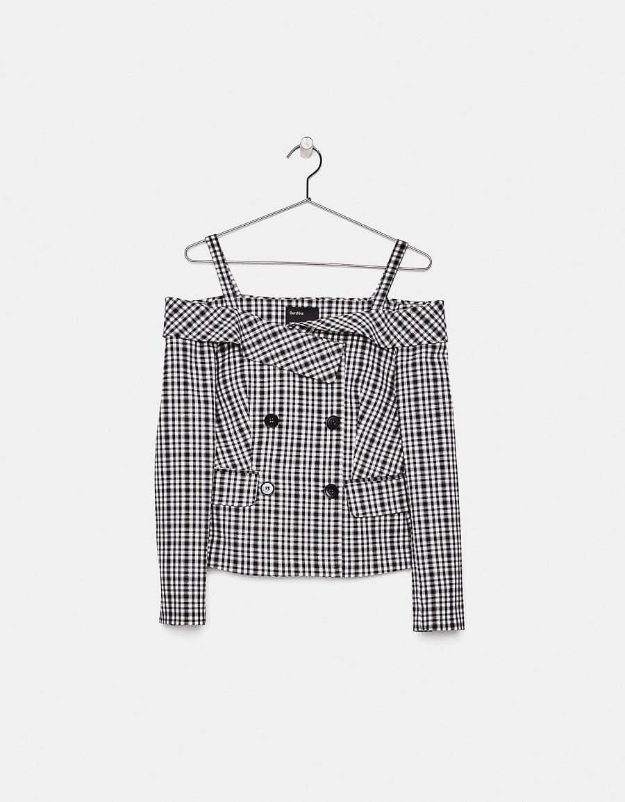 Checked blazer with bardot neckline, Bershka, IDR 259,900