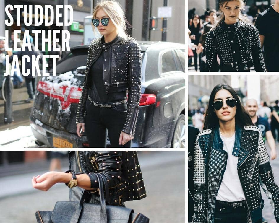 Jaket kulit dengan detail studded ini bisa kamu padupadankan dengan leather a-line skirt dan ankle boots akan membuat penampilanmu lebih provocative and little bit grunge.