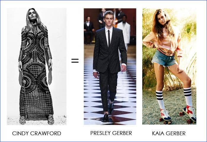 Kedua anak supermodel Cindy Crawford yaitu Presley dan Kaia Gerber juga mengikuti jejaknya. Belum lama ini Presley Gerber terlihat di pertunjukkan runway di Men's Fashion Week. Sedangkan adiknya, Kaia Gerber juga pernah tampil di majalah Teen Vogue dan belum lama ini tampil di kampanye iklan brand eksklusif Miu Miu.