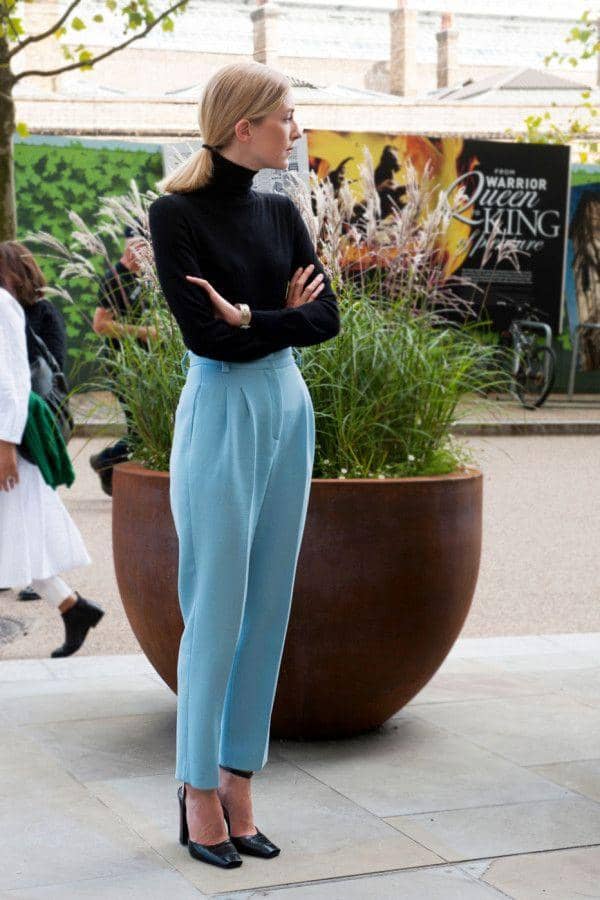 Ciptakan penampilan business casual yang stand out dengan celana biru langit yang cerah. Kamu bisa memadukannya pakai atasan turtle neck warna hitam jika nggak ingin terlalu mencolok. Kenakan loafers dengan hak rendah sebagai kesan feminin yang rapih.