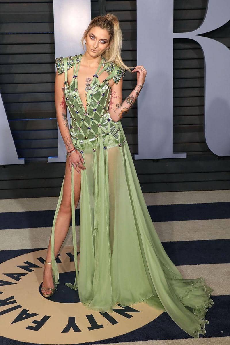5. Vanity Fair Oscars party semakin meriah dengan kehadiran Paris Jackson mewakili mendiang ayahnya sambil memakai gaun seksi warna hijau rancangan Versace.