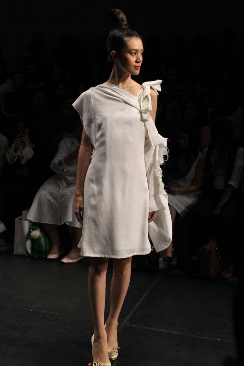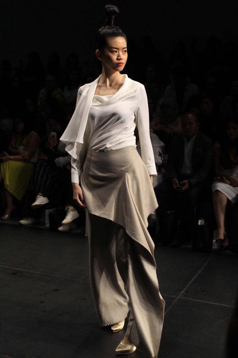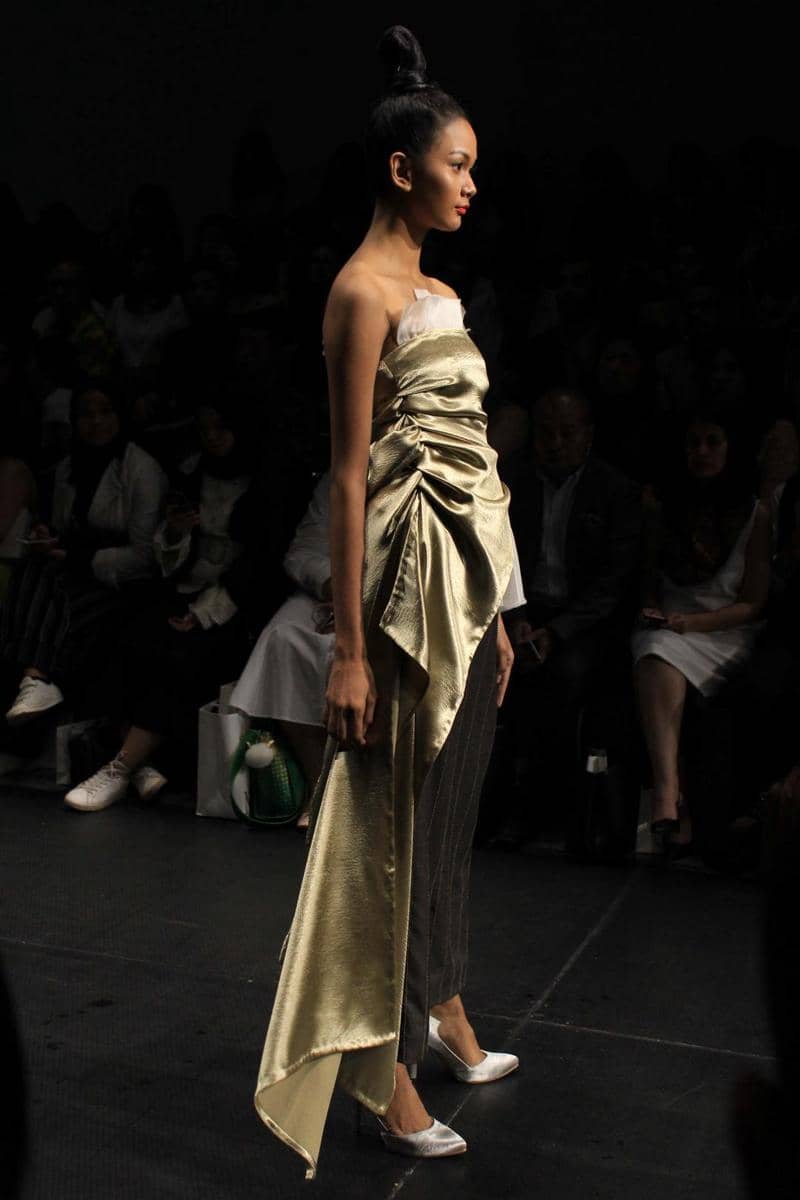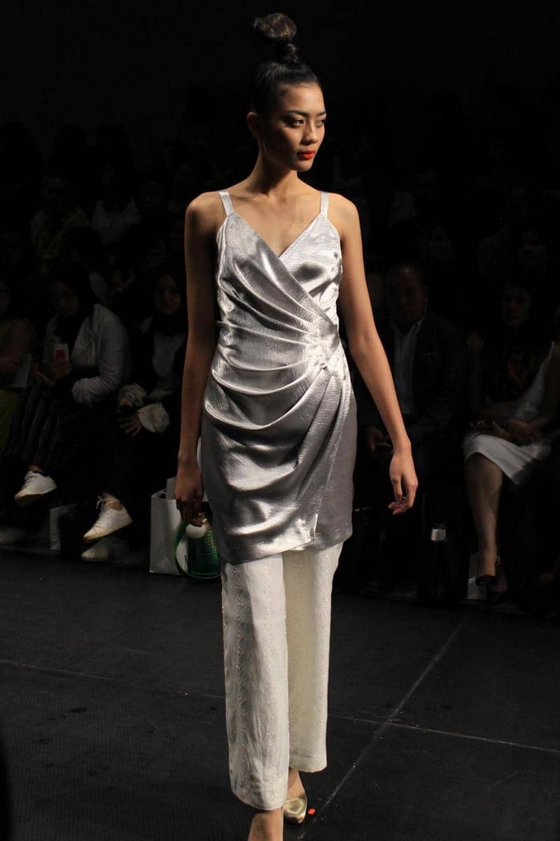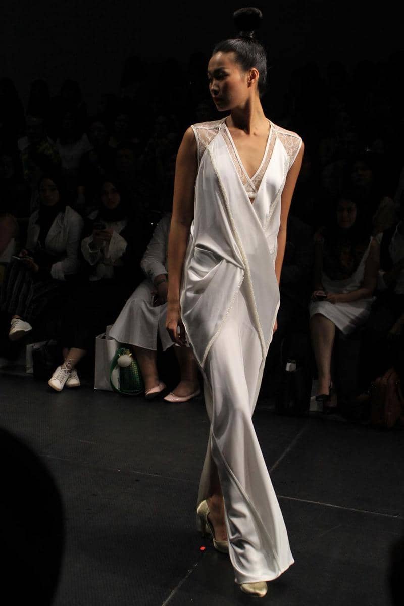 Ada yang berbeda di koleksi Jeffry Tan yang kemarin dipresentasikan di Plaza Indonesia Fashion Week 2017. Mungkin beberapa ekspektasi seperti busana tailoring, busana terstruktur hingga jumpsuit akan kembali tampil di sini. Nyatanya, 'mereka' semua absen (note: hanya ada satu jumpsuit) pada koleksi yang bertajuk White Stories ini. Yang nampak adalah deretan koleksi putih bernuansa resort. Tetap dengan gaya Jeffry Tan yang penuh detail dekonstruktif. Permainan drapery yang fluid dengan aksen metalik. Sehingga menghasilkan tekstur yang jatuhnya indah saat dikenakan.