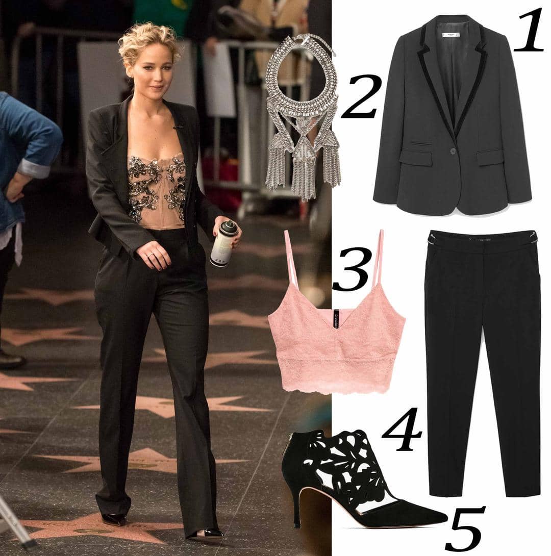 Inspirasi gaya Jennifer Lawrence yang satu ini agak terlihat 'daring' nih Bela! Cocok untuk kamu yang mau menggabungkan kesan strong dan seksi sekaligus. Di sini Jennifer Lawrence tampak keren dalam padu-padan blazer dengan atasan corset. Untuk menambah kesan elegan kamu bisa mengenakan kalung yang statement.