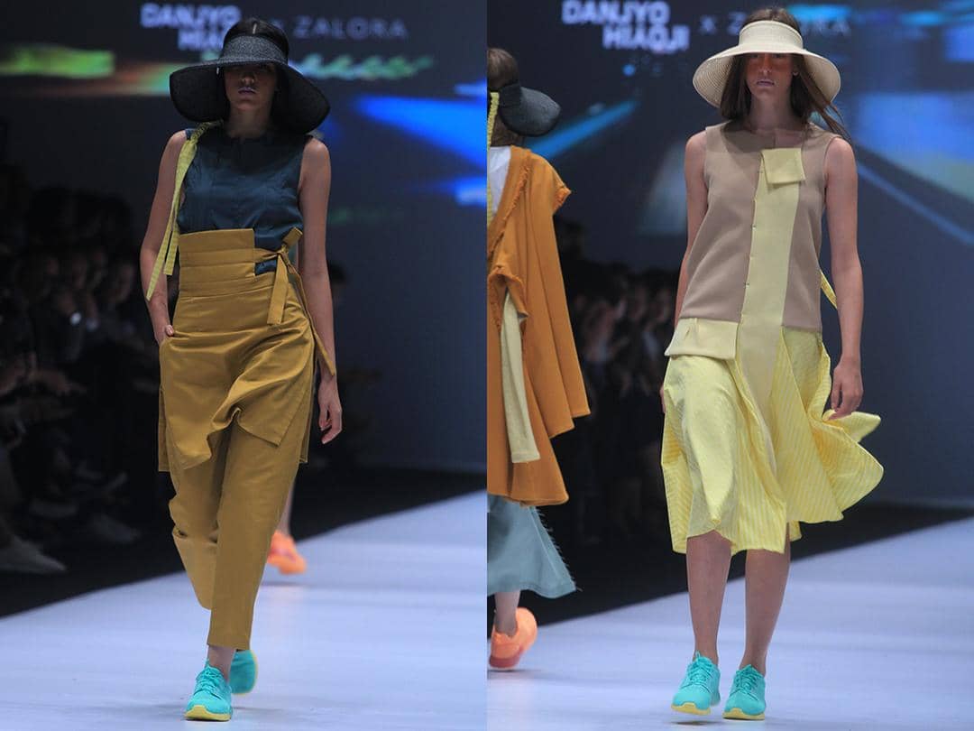 Danjyo Hiyoji dikenal dengan koleksi yang unisex! Sengaja atau tidak, sang desainer dari dulu memang selalu menampilkan koleksi yang bisa dikenakan oleh pria atau pun wanita. Jika kita kilas balik ke koleksi di musim-musim sebelumnya, pasti kita bisa deh menemukan beberapa pieces yang potongannya masuk untuk pria dan wanita - terutama yang bersiluet kebesaran. Kesan unisex yang sudah melekat memang menjadi karakter dari Danjyo Hiyoji, yang membuatnya terkenal dikalangan pecinta gaya street. Tapi sekarang, Dana Maulana dan Liza Mashita berniat menghapus anggapan "label unisex" tersebut. Kini keduanya, memisahkan mana yang untuk pria dan mana yang untuk wanita, lewat koleksi kolaborasinya dengan Zalora, malam ini, pesan tersebut diutarakan dengan lantang. Panggung JFW pun terasa hidup dengan musik upbeat yang selalu... dan selalu... dihadirkan hanya dari Danjyo Hiyoji. Pertama dibuka oleh para model pria yang mengenakan jubah "We are Danjyo Hiyoji", dan diteruskan oleh parade koleksi warna-warni (yes, warna-warni), yang playful untuk Spring/Summer 2017.