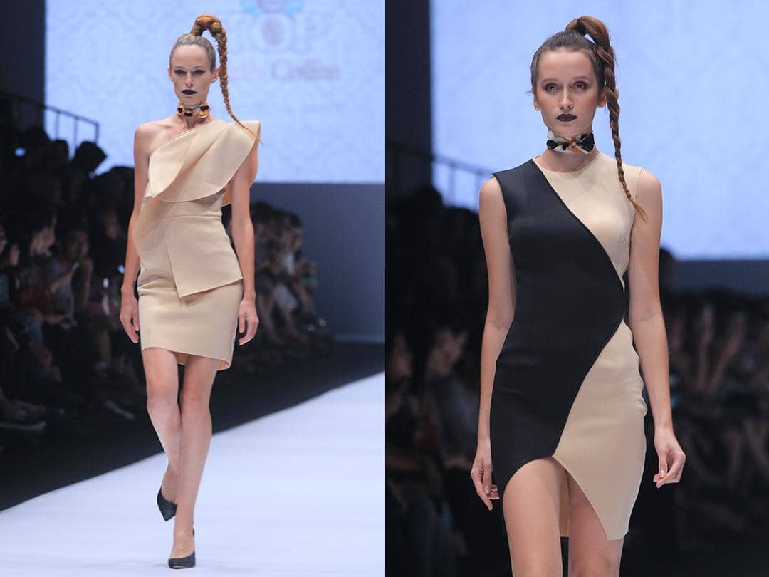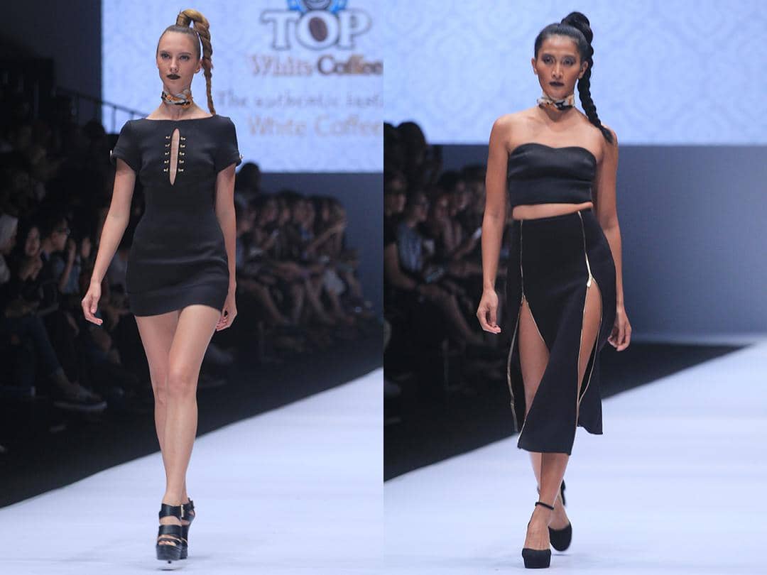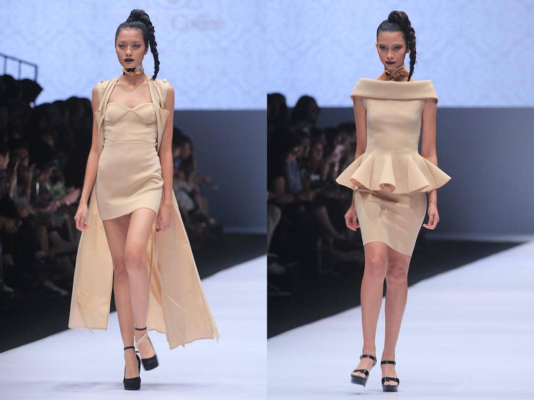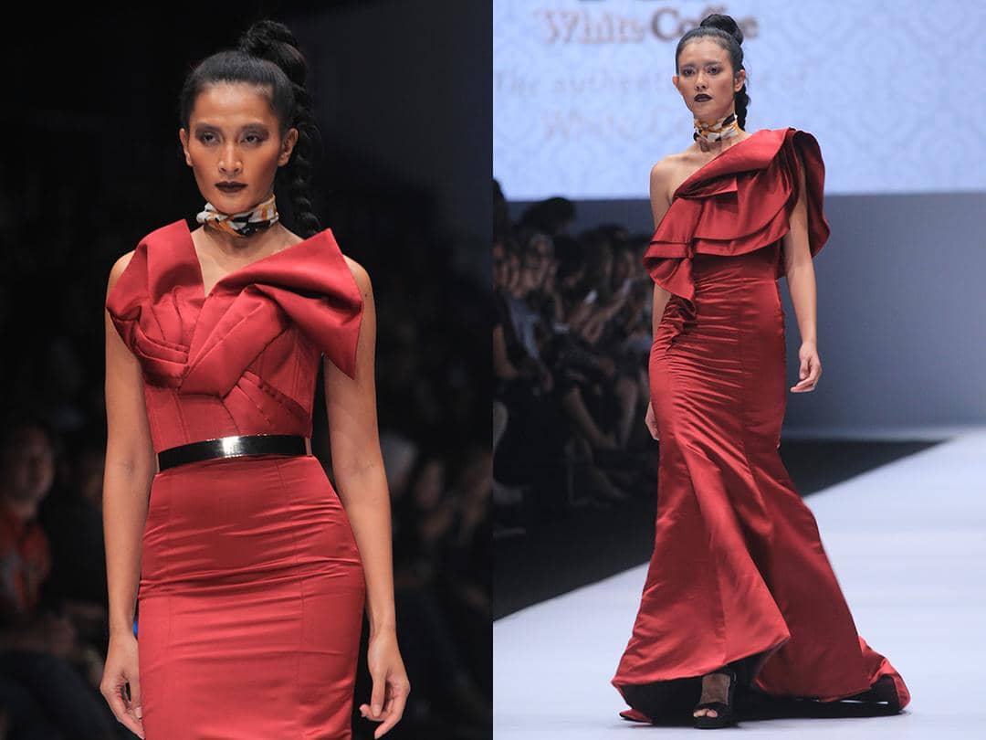 Mempertahankan sisi keseksian tersebut, ia juga menginjeksikan playful spirit, dimana aksen ruffle, puffy sleeves, menjadi pemanis yang pas untuk mengimbangi kesan strong look dari keseluruhan koleksi ini. Selagi show-nya berlangsung, Lotuz kembali menghadirkan sesuatu yang familiar, yaitu signature moon shaped jumpsuit - yang di-twist dengan bahan neoprene. Beberapa cocktail dress pun hadir dengan gold pin yang memberikan efek finishing touch yang elegan. Keahliannya dalam mengolah cocktail dress sudah cukup oke, tapi untuk gaun-gaun besar, rasanya dua gaun merah yang menutup show malam itu tampak kaku dengan efek draping yang kurang natural. Kedepannya mungkin ini bisa menjadi tantangan baru bagi Kesya Moedjenan.