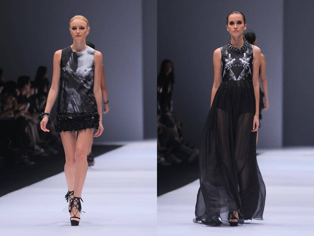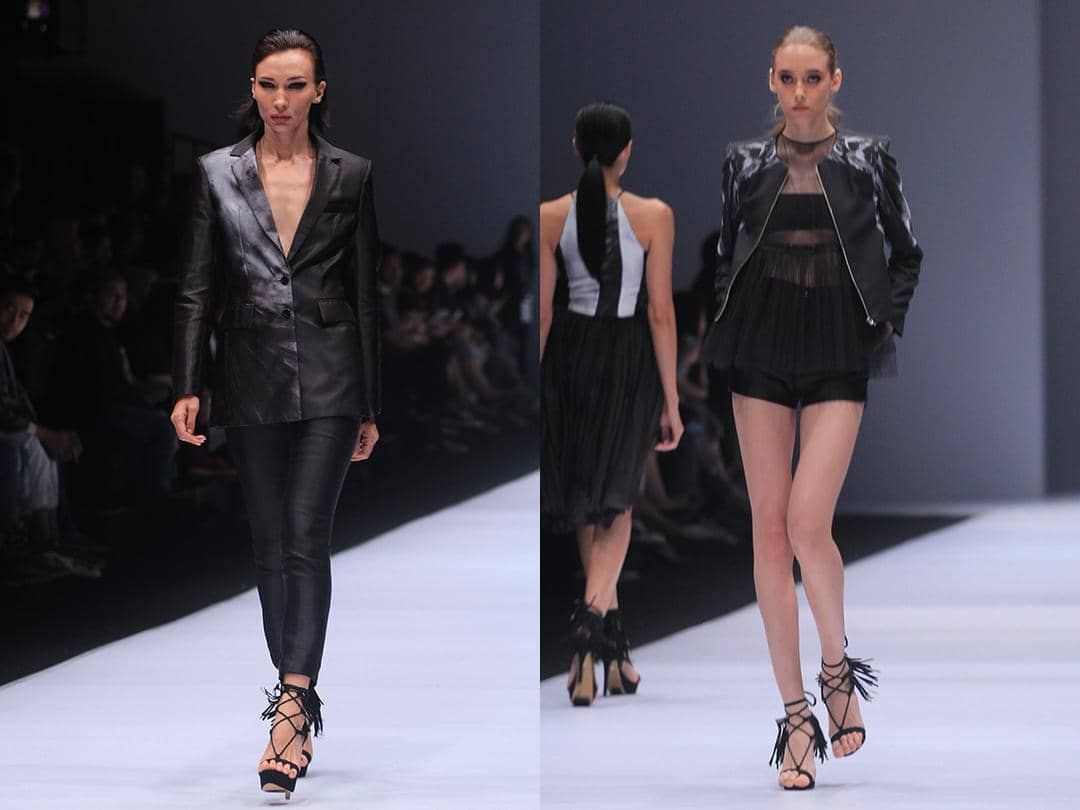 Unsur glamor digantikan dengan warna metalik yang hidup dalam bahan hitam yang selalu dipakai oleh Yosafat. Modern shapes - cropped top dengan pencil skirt - merupakan siluet khas-nya yang sekali lagi mudah kena ke hati para customer-nya. Jaket-jaket berbahan stiff yang dipadukan dengan busana tembus pandang juga terlihat seductive dan masih terlihat "ramah" untuk dikenakan para wanita masa kini. Dan satu lagi yang tidak boleh terlewatkan adalah skill Yosafat dalam menghadirkan tailored pieces patut diakui. Julia Kotuleva kembali menjadi model pembuka yang mengenakan tailored blazer yang terlihat strong sekaligus misterius.