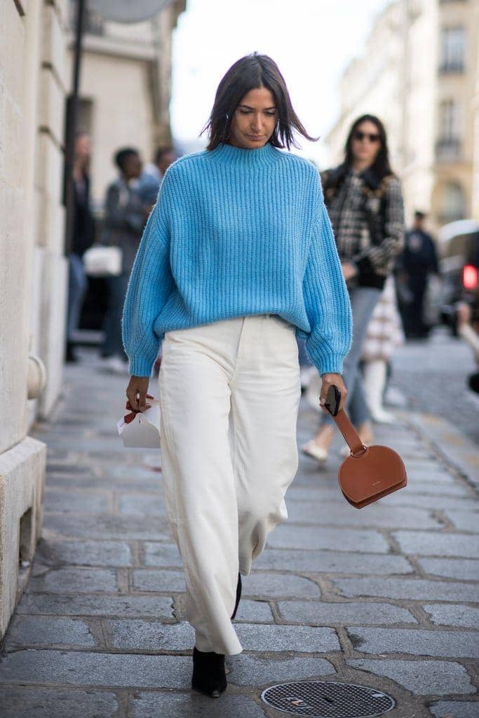 Jeans putih memang bisa memberikan kesan chic secara instan. Apalagi disatukan dengan sweater berwarna biru seperti ini.