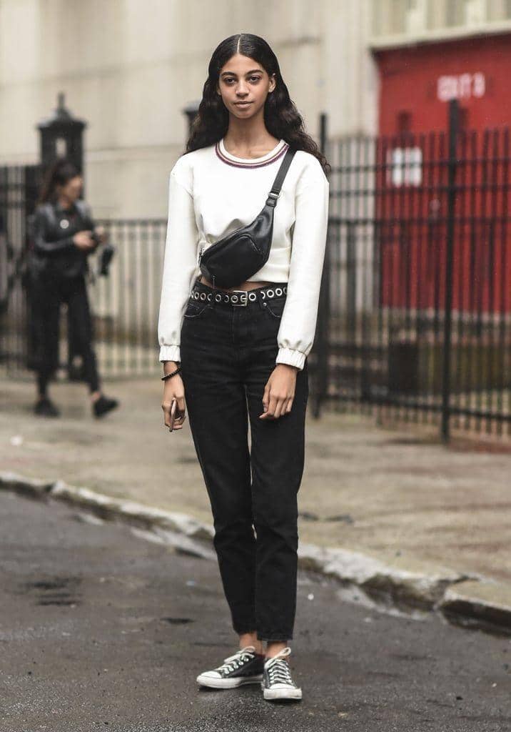 Gaya seperti ini memberikan kesan yang rebel. Selain pakai fanny pack, tambahkan statement belt ya.