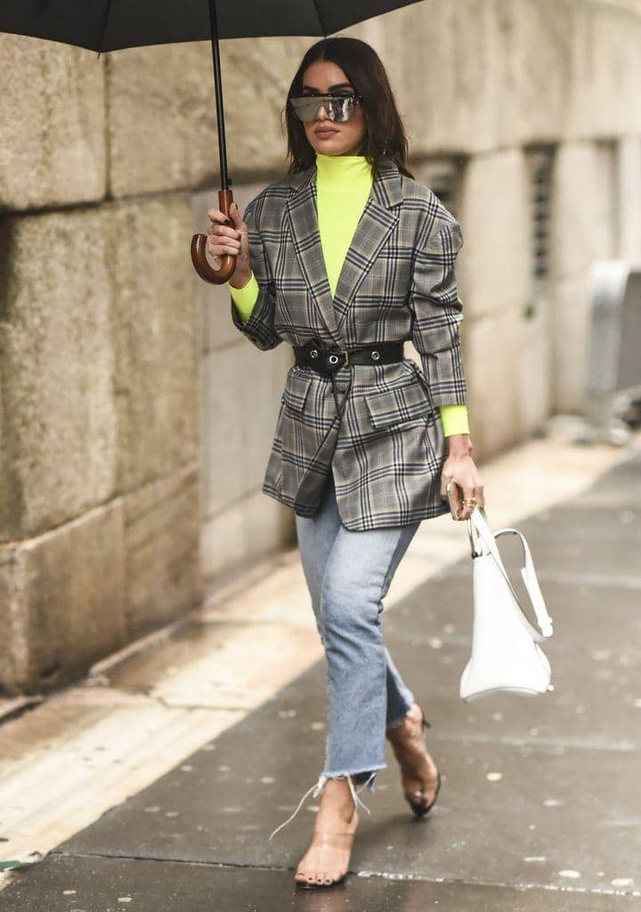 Sentuhan sweater neon yang jreng bisa kamu rendam dengan mengenakan luaran yang formal dan jeans biru yang kasual.