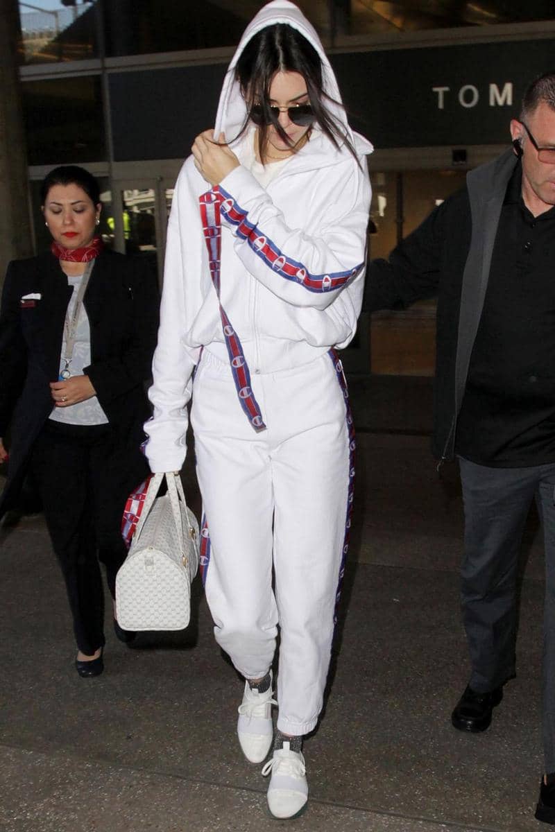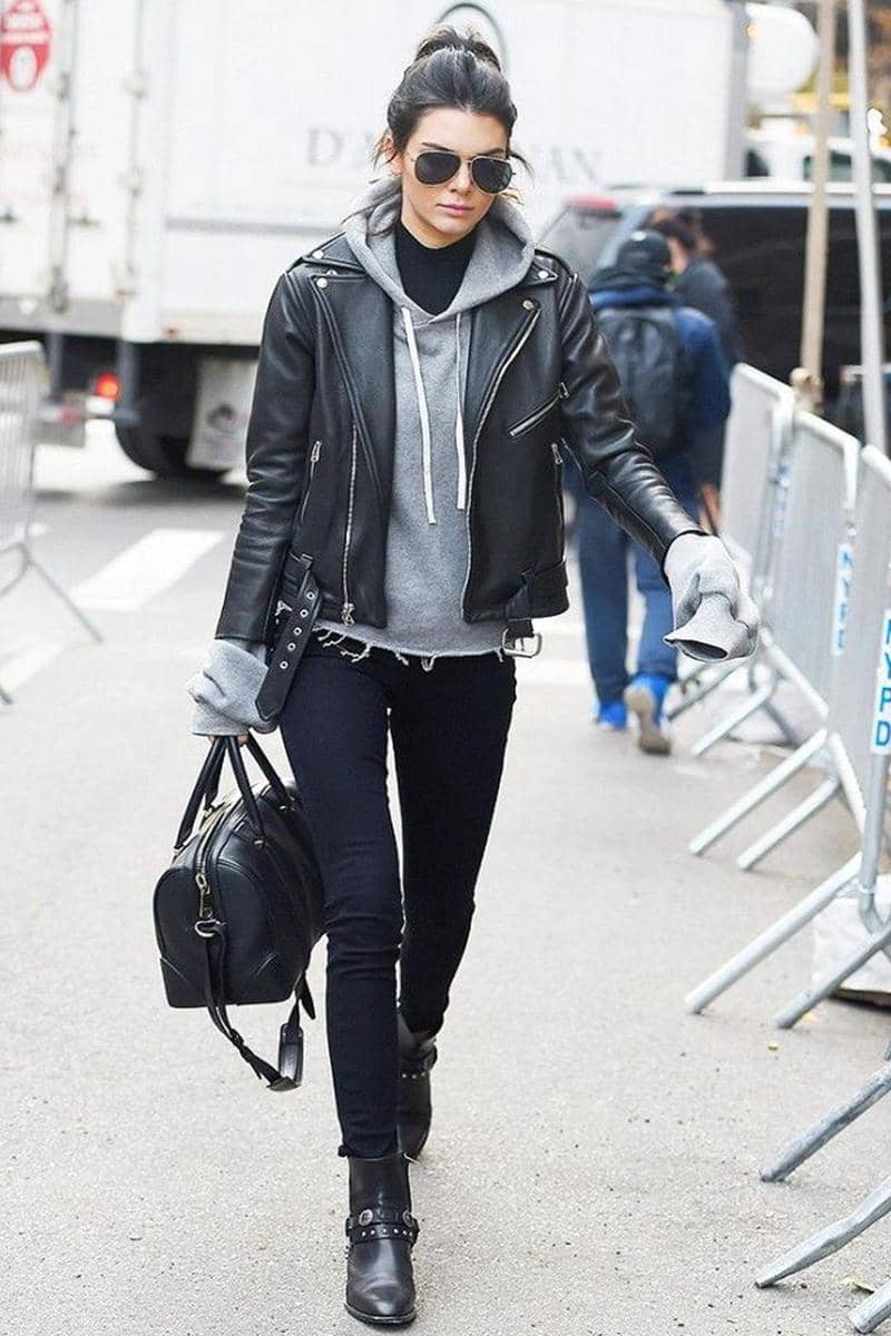 1. Kendall Jenner membawa hoodie style ke dalam nuansa edgy lewat sentuhan jaket kulit.