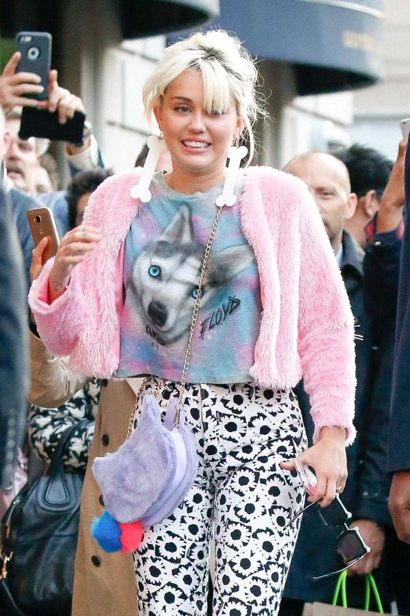 5. Statement earrings ditambah dengan fur jacket dan tak ketinggalan tas yang super cute, Miley tahu betul bagaimana caranya tampil out of the box.