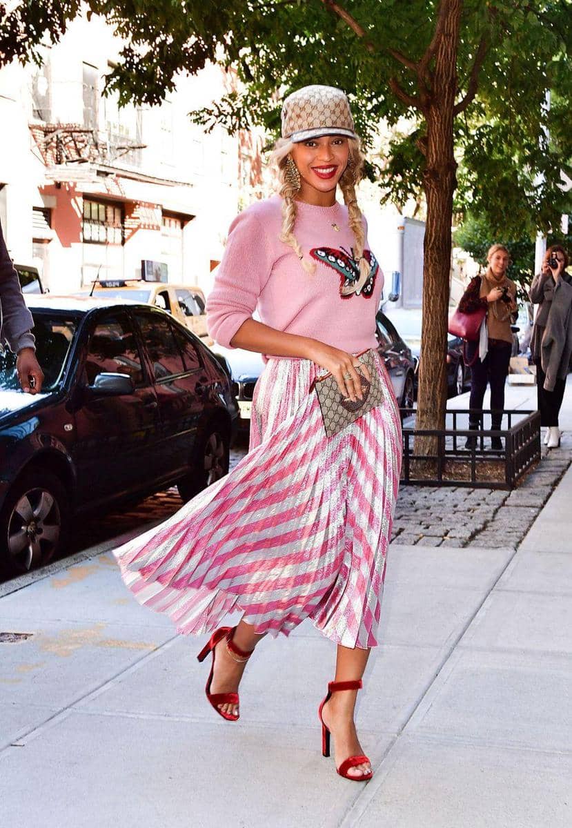 Pemilihan warna pink yang mendominasi tampilan Beyoncé pada look ketiga membuatnya terlihat lebih fresh dan ceria. Ia memadu-padankan dengan sweater berhiaskan kupu-kupu bersama pleated skirt perpaduan warna pink dan putih. Agar tidak monoton, ia memilih high heel warna merah dengan bahan velvet serta statement earrings. Trik dari Bey bisa kamu tiru nih! Berikan sentuhan warna bold ketika lagi memakai busana warna senada.