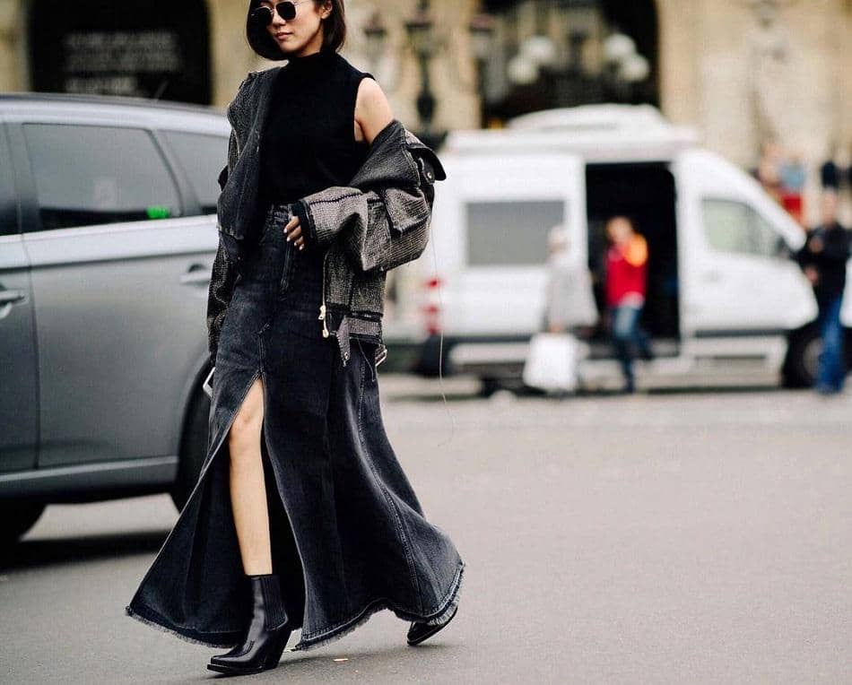 Suka berpenampilan edgy? Contek style Yoyo Cao ini yuk! Padu-padankan turtleneck dan denim slit skirt, jacket jeans, serta sepatu boots. Gaya edgy-mu jadi semakin keren!