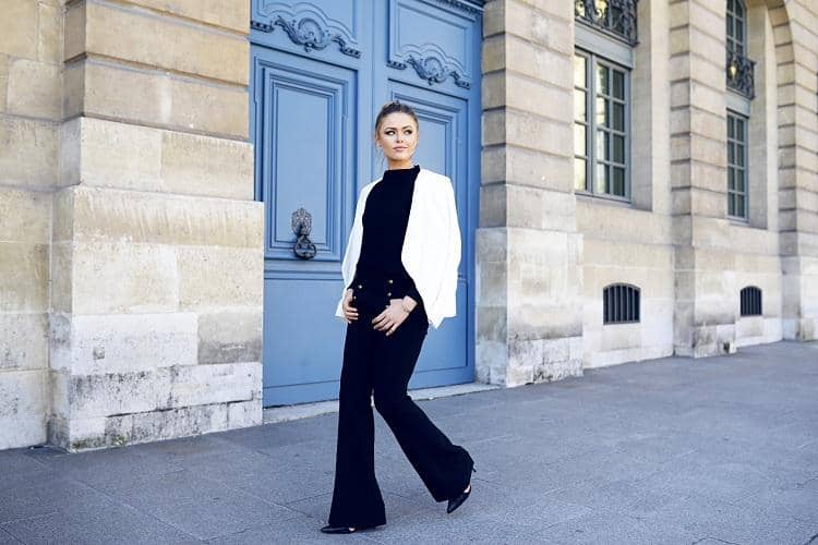 6. Kristina Bazan percaya bahwa celana flare mampu menyeimbangkan volume pinggang dan paha sehingga tampilan makin terlihat slim dan jenjang.