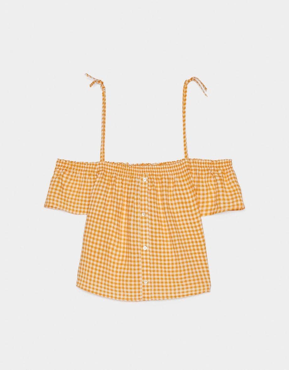 Check off-the-shoulder blouse, Bershka, IDR 279,900