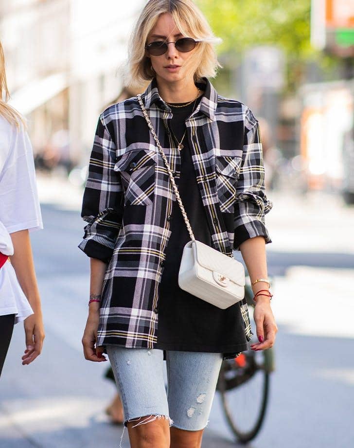 4. Santai menikmati hari dengan mengenakan celana pendek jeans yang di mix n match bersama t-shirt hitam dan juga kemeja flannel. Tambahkan aksesori kesayangan untuk upgrade tampilannya!
