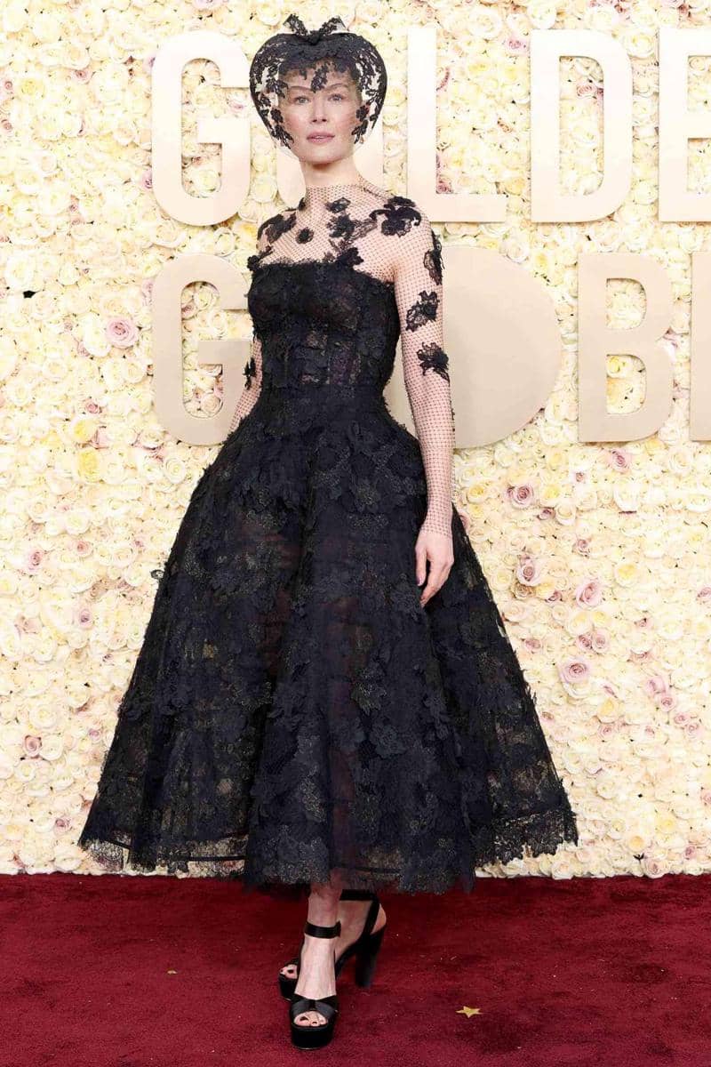 Golden Globes 2024 menjadi salah satu momen untuk para artis menampilkan gaya terbaik menggunakan outfit karya desainer terkenal. Salah satu aktris yang gayanya mencuri perhatian ialah Rosamund Pike. Pada momen tersebut, pemeran Elspeth Catton di film Saltburn ini hadir menggunakan pakaian rancangan Dior Couture berupa black lace midi dress yang matching dengan headpiece.