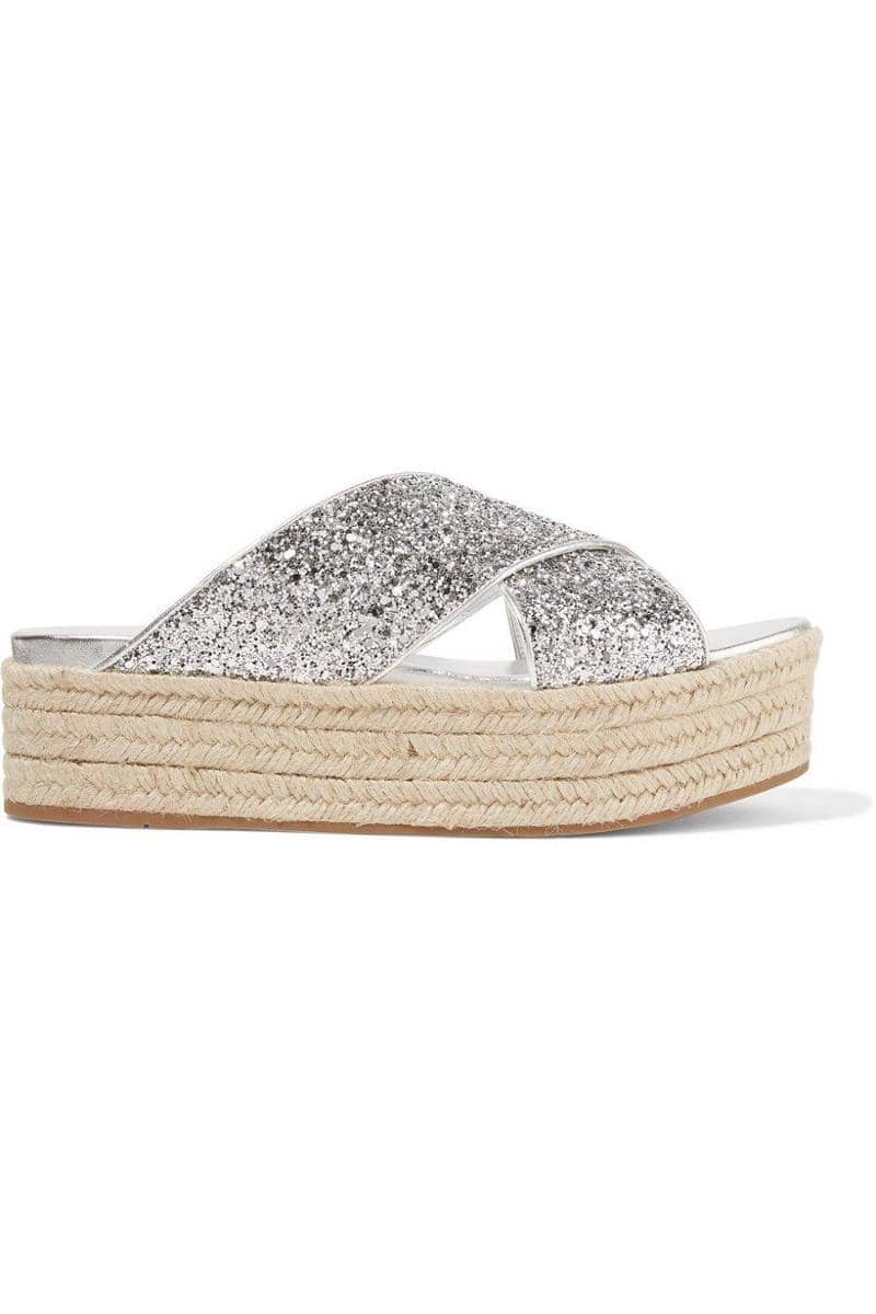 Glittered leather espadrille platform sandals, Miu Miu, $580