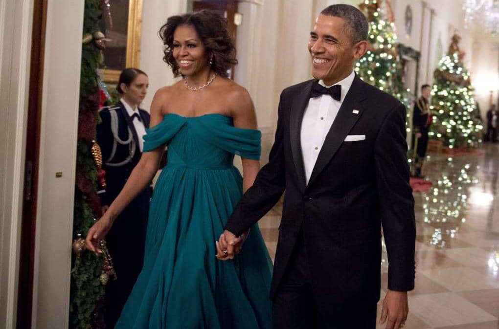 Menghadiri The 36th Kennedy Center Honors Gala, Michelle kembali berhasil memancarkan pesonanya lewat gaun off shoulder klasik berwarna hijau yang diberi tambahan aksesoris kalung dan anting cantik.