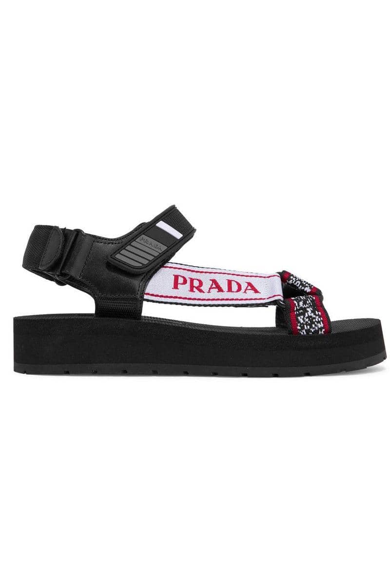 Logo-embossed rubber-trimmed leather and canvas sandals, Prada, $441