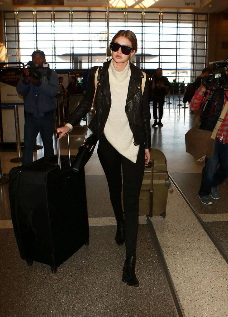1. Ini trik yang paling simple dari Gigi Hadid. Kombinasikan leather jacket, jeans, dan turtleneck sweater, plus boots... done!