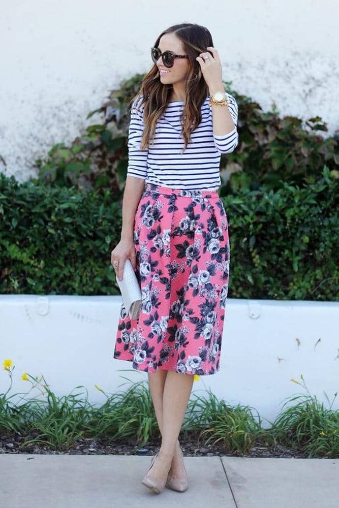 3. Pasangkan stripe shirt-mu dengan rok bermotif floral. Perfect!