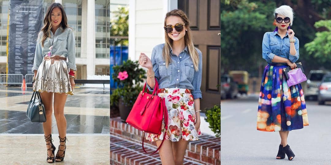 1.Tampilan manis dan girly bisa kamu dapatkan dengan memasangkan denim shirt-mu dengan pattern skirt. Super chic!