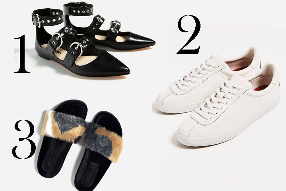 SEE NOW BUY NOW: 1. Flat Strappy, ZARA, IDR 799,900 ; 2. Leather Plimsolls, ZARA, IDR 899,900 ; 3. Faux Fur Slides, ZARA, IDR 559,900