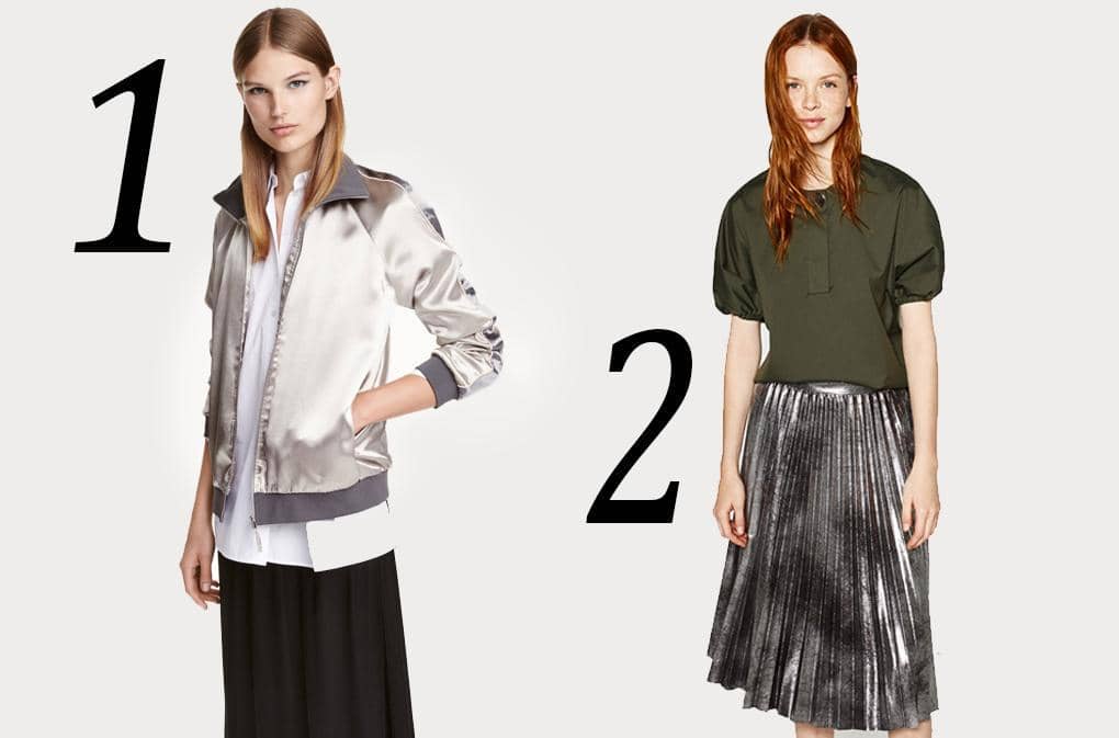 1. Metallic bomber jacket, H&M, IDR 599,900 ; 2. Metallic pleats skirt, ZARA IDR 899,900