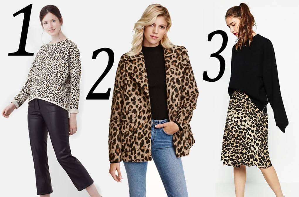 1. Leopard sweater, Mango, IDR 349,000 ; 2. Leopard outerwear, H&M, IDR 999,900 ; 3. Leopard skirt, ZARA, IDR 599,900