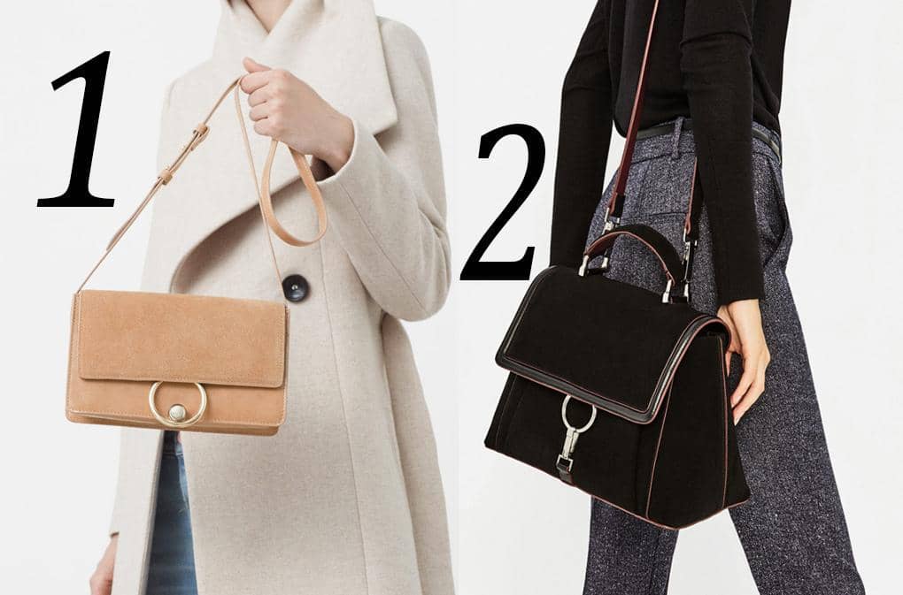 1. Shoulder bag, Mango, IDR 599,000 ; 2. Suede satchel bag, ZARA, 999,900