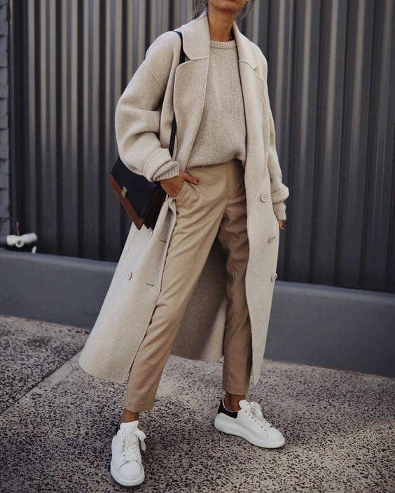 1. Perpaduan warna gradasi cokelat muda tampak semakin istimewa saat dipasangkan dengan sneakers putih. Butuh tampilan lebih warm? Coba kenakan scarf warna merah marun polos sebagai aksen.