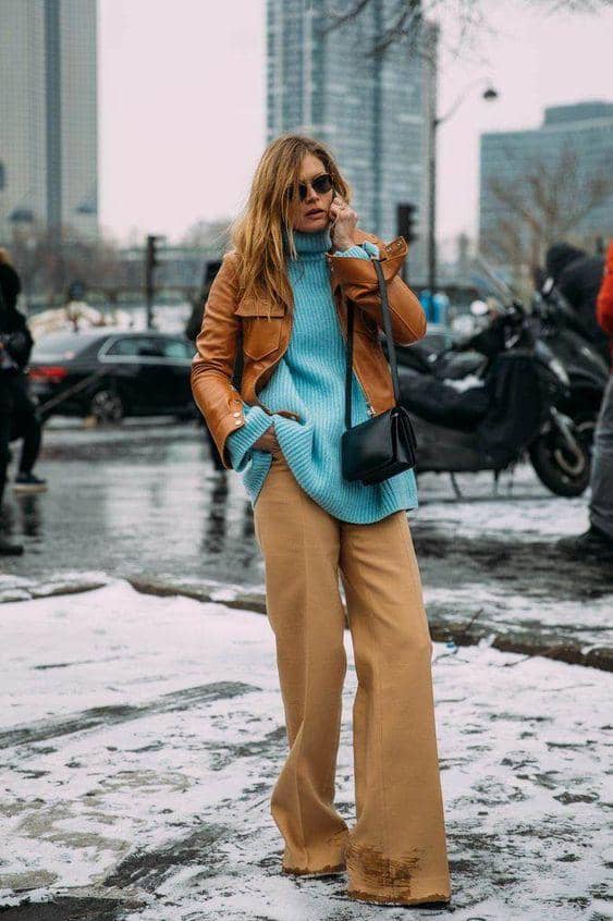 2. Tampil menawan dengan memasangkannya bersama sweater rajut model turtleneck. Pilih tone warna cokelat yang agak terang.