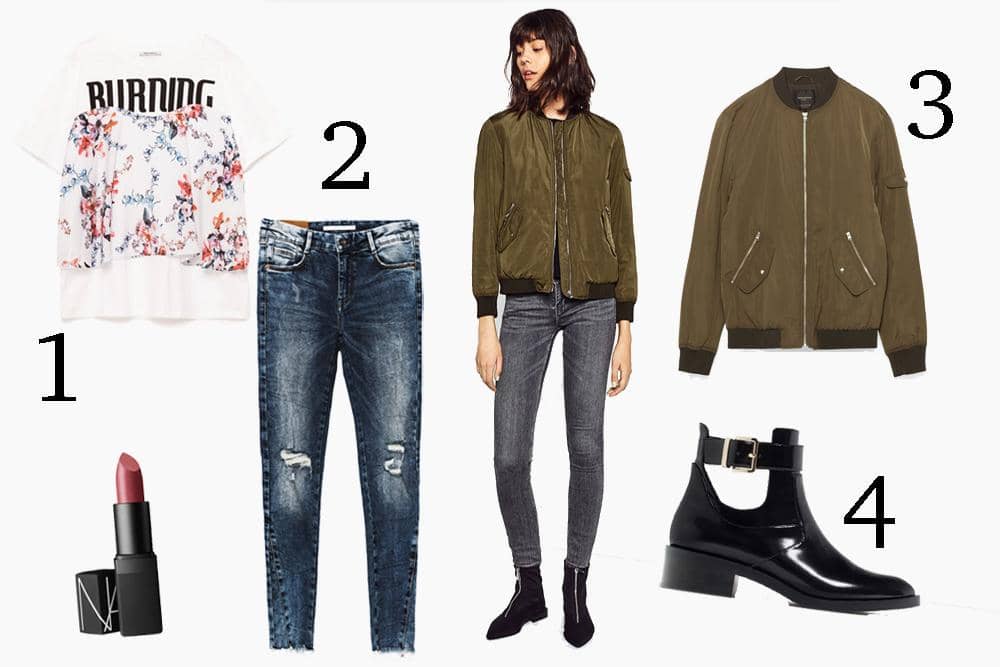 SEE NOW BUY NOW: 1. Frilled printed t-shirt, ZARA, IDR 359,900; 2. Skinny ripped denim, ZARA, IDR 559,900 ; 3. Bomber jacket, ZARA, IDR 599,900 ; 4. Flat open ankle boots, ZARA, IDR 559,900