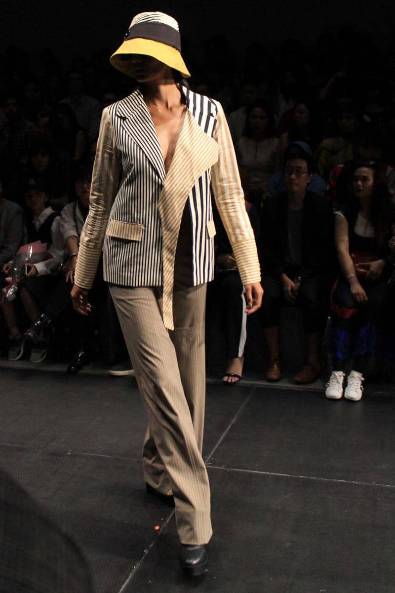 Jika pada sebelumnya banyak didominasi dengan busana tailoring, kali ini koleksinya terasa lebih light dan playful dengan berbagai kemeja garis-garis dan beberapa jaket dekonstruktif. Sebuah tanda yang bagus. Dimana Tri Handoko bermain dengan jiwa yang ceria. Walau dalam aksen tabrak warna, akar androgininya masih terasa. Apalagi dengan bucket hat yang sudah menjadi ciri khas Tri Handoko.