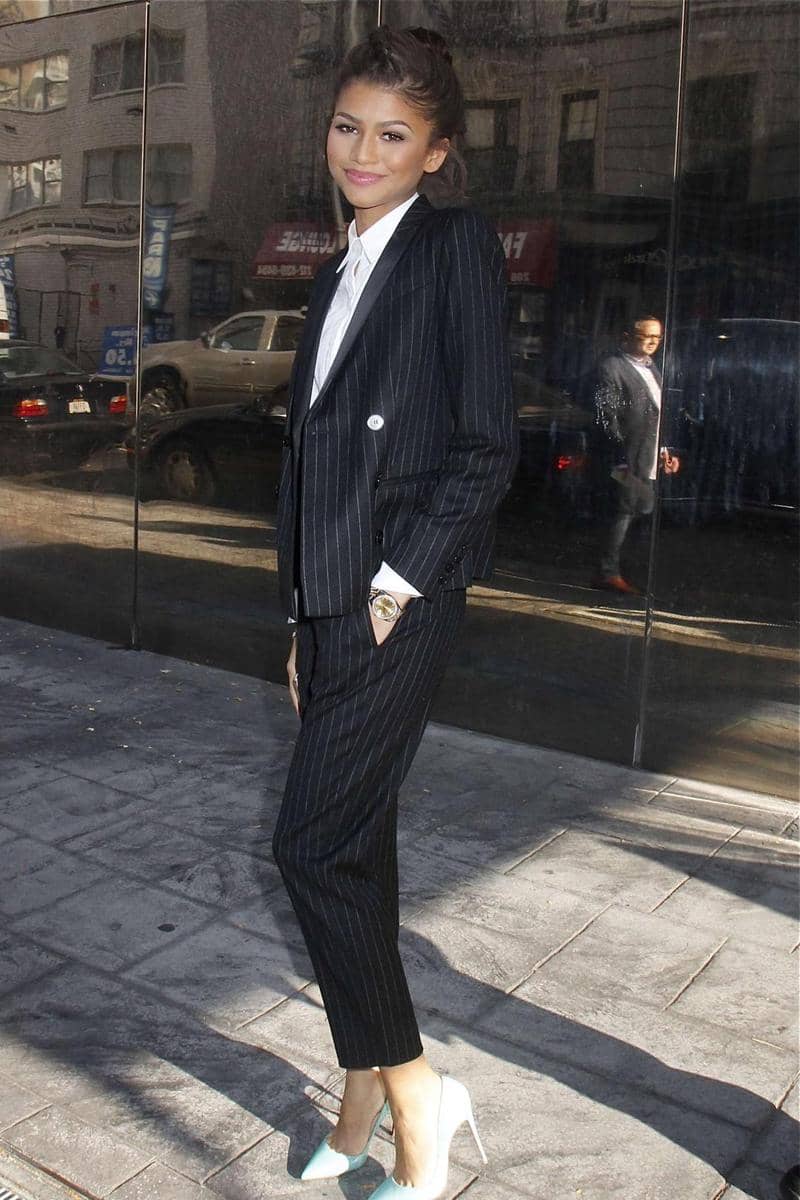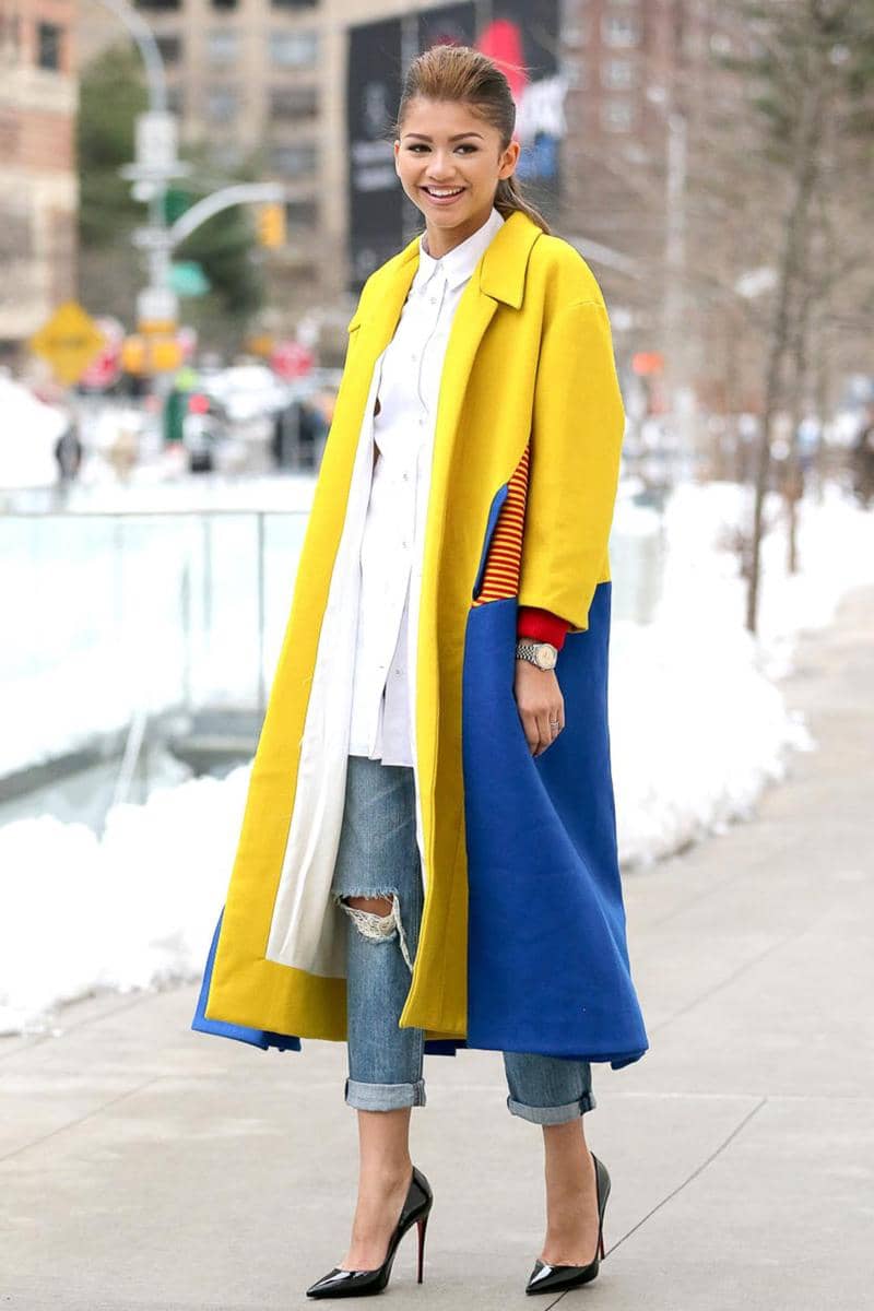 4. Zendaya memilih menyempurnakan tampilan dengan statement jacket dengan dual-tone style.