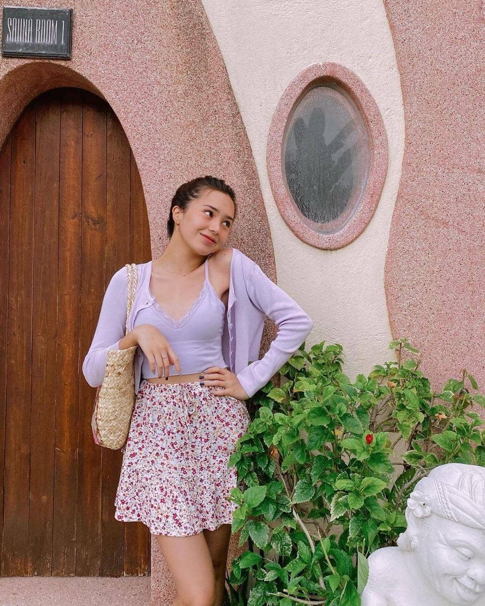 6. Beby Tsabina memasangkan tank top dengan cropped cardigan dan floral mini skirt bernuansa pastel. Layaknya cewek Korea!