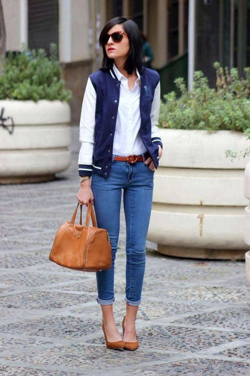 5. Varsity jacket memang paling pas dipasangkan dengan denim dan kemeja putih. Kamu akan terlihat uber cool!