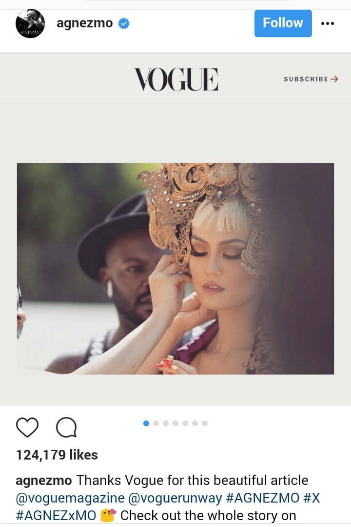 Rasa bangga dan syukur pun diucapkan penyanyi berusia 31 tahun ini lewat akun Instagramnya. "Terima kasih Vogue untuk artikel cantik ini." tulis Agnez dalam caption fotonya. Sukses terus, Agnez!