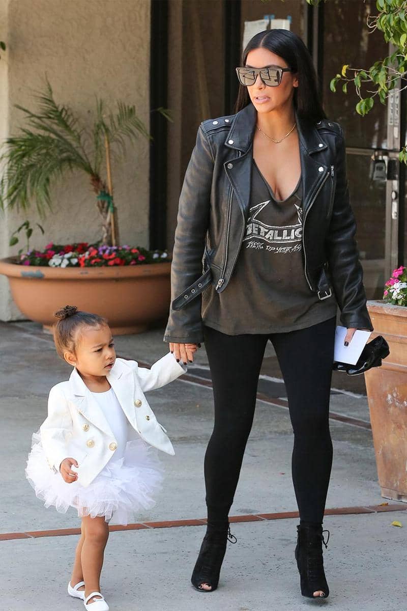 5. Kim Kardashian terlihat on point dengan memadukan jaket kulit dan kaos print-nya.